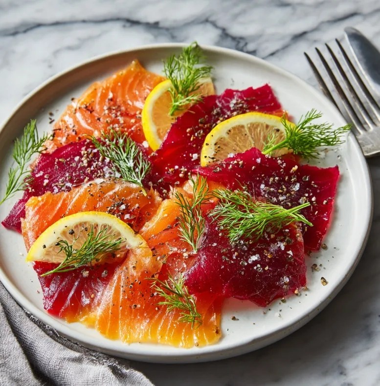 A vibrant Scandinavian-style salmon cured with beetroot, dill, salt, and sugar for a silky, elegant appetizer.