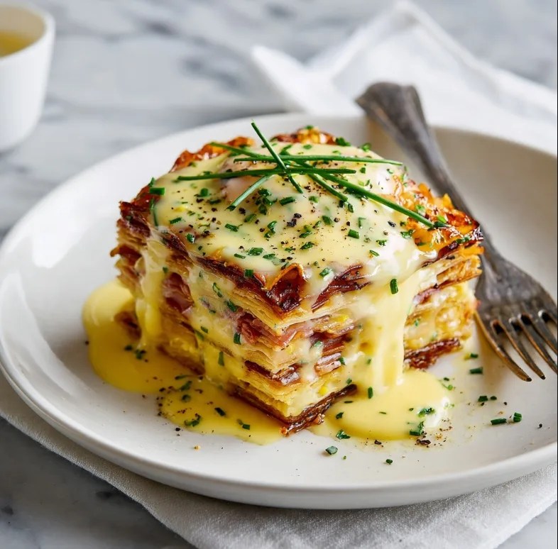 Eggs Napoleon is inspired by the layered French pastry dessert known as mille-feuille (sometimes called “Napoleon”). Instead of sweet custard layers, this savory version stacks puff pastry, ham or smoked salmon, perfectly poached eggs, and luscious hollandaise sauce.